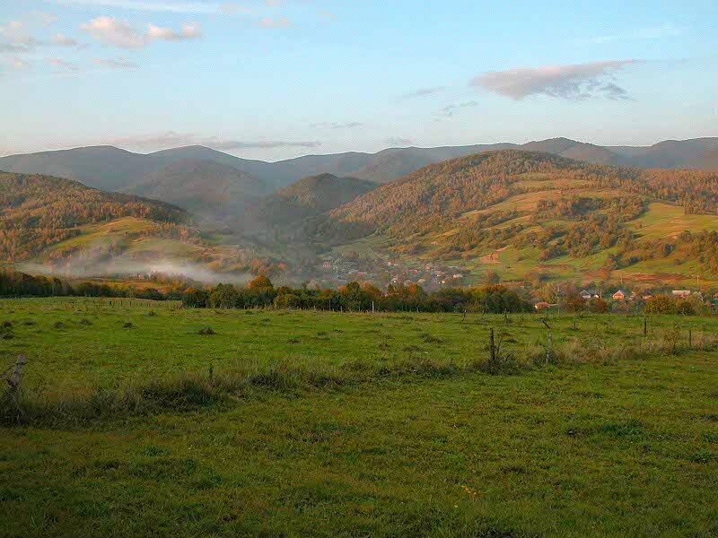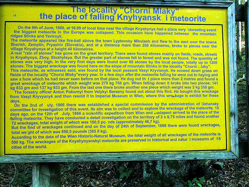 Bez tych "naczytanych" historyjek miejsce takie sobie. Zamiast dawnej łąki koszonej przez Wasyla z Kniahyni dziś młody, bukowy las i niewielkie obniżenie terenu w miejscu upadku meteoru. Trudno wprost uwierzyć, że przed półtorej wiekiem wielki z kosmosu wybił tu dziurę. Oczywiście jest jeszcze ten pamiątkowy kamień, który przekonuje, że to tu. Szlaku nie ma, bez przewodnika ani rusz. Nam oprócz pracownika z Użańskiego Parku towarzyszył żołnierz ichniej Straży Granicznej z psem.